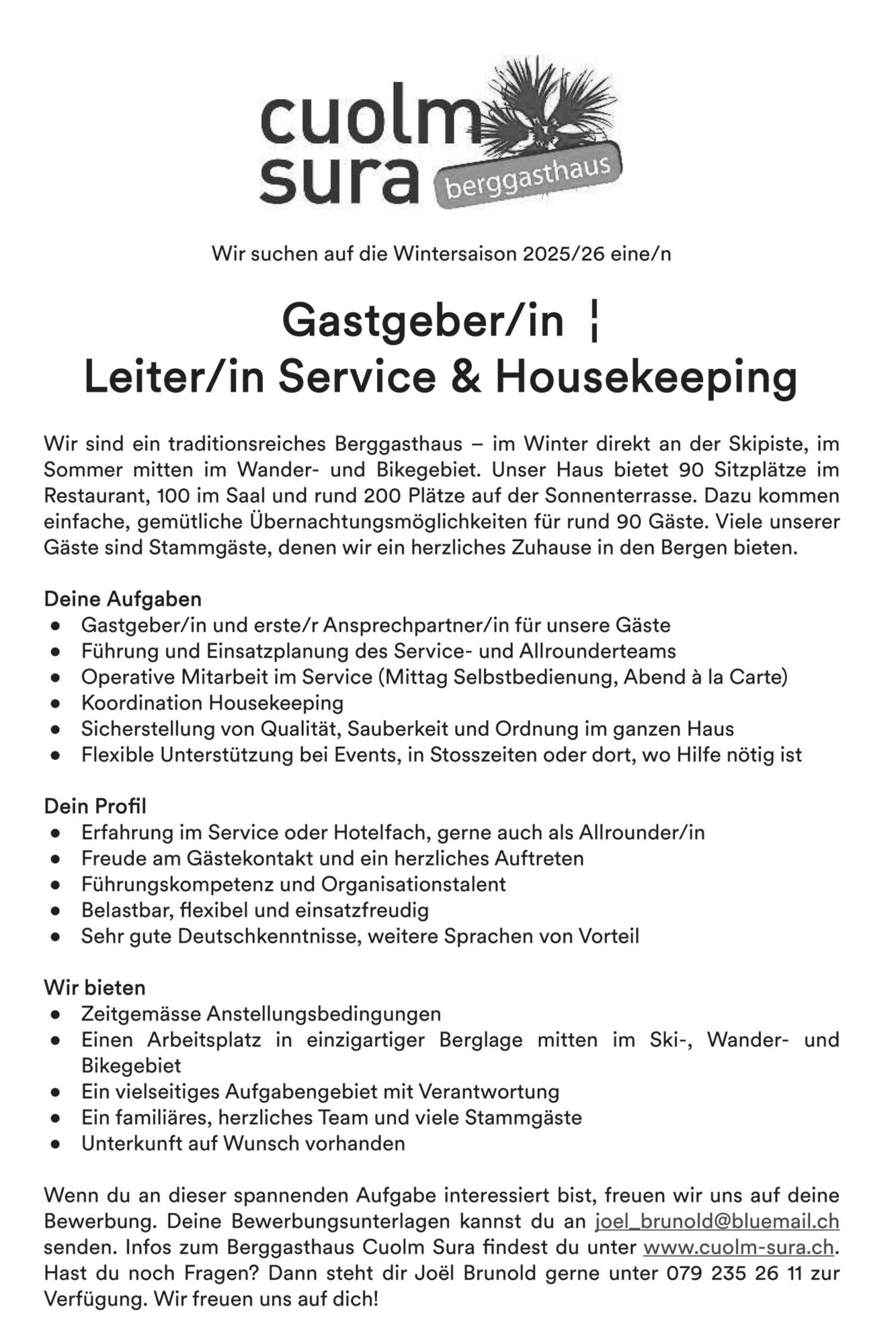 Wenn du an dieser spannenden Aufgabe interessiert bist, freuen wir uns auf deine Bewerbung. Deine Bewerbungsunterlagen kannst du an joel_brunold@bluemail.ch senden. Infos zum Berggasthaus Cuolm Sura findest du unter www.cuolm-sura.ch. Hast du noch Fragen? Dann steht dir Joel Brunold gerne unter 079 235 26 11 zur Verfügung. Wir freuen uns auf dich!